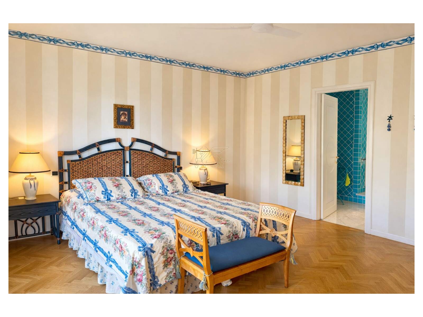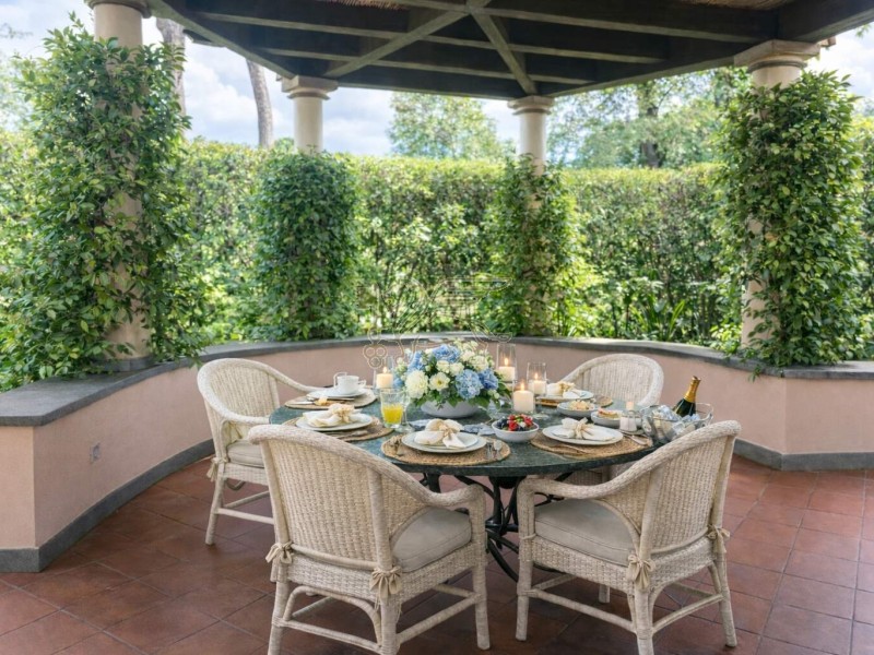 This villa for sale in Forte dei Marmi features Tuscan terracotta floors, wooden parquet, and ceramic bathrooms, giving it a simple, refined, and welcoming atmosphere