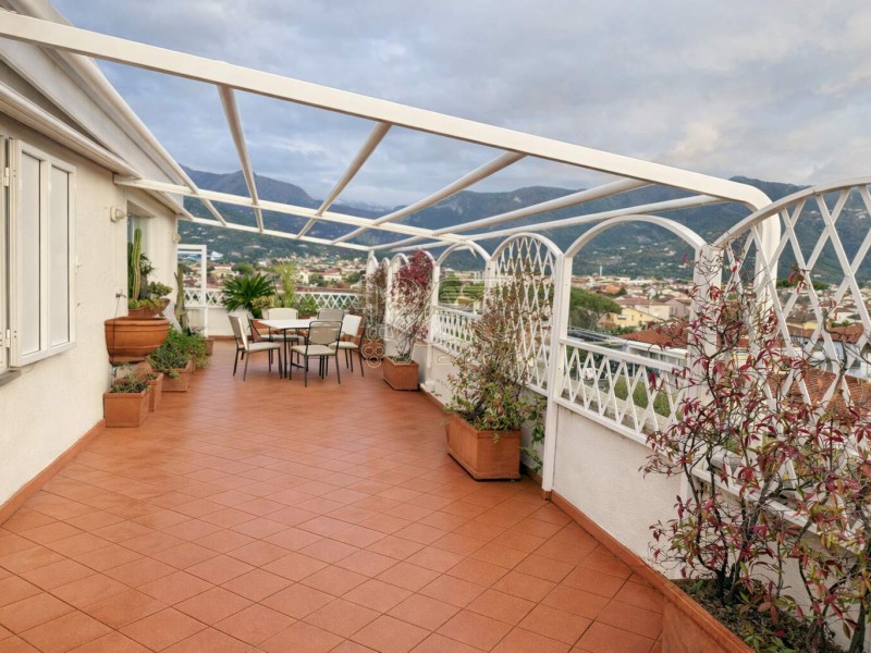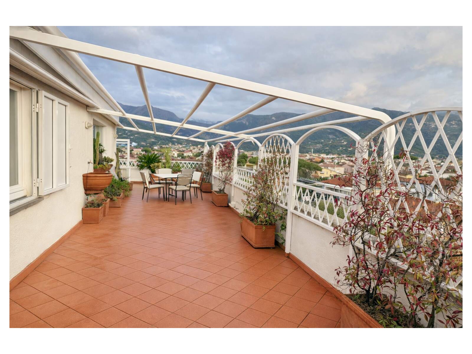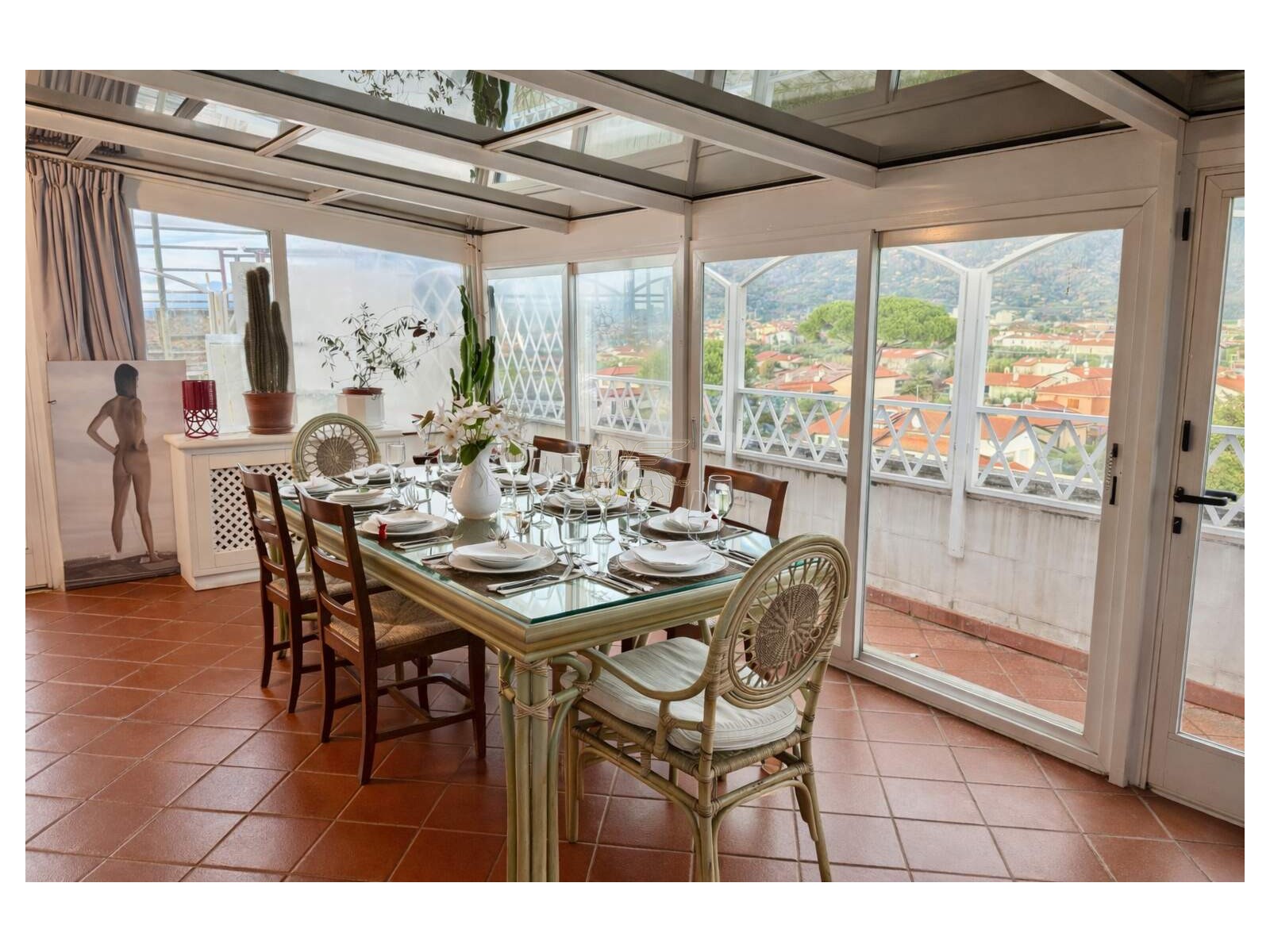 The true heart of the home is the magnificent panoramic terrace of approximately 80 square meters, directly accessible from the living area. From here, views of the Apuan Alps open up, offering a picturesque backdrop in every season: an exclusive space perfect for dining, moments of relaxation and conviviality in complete privacy.