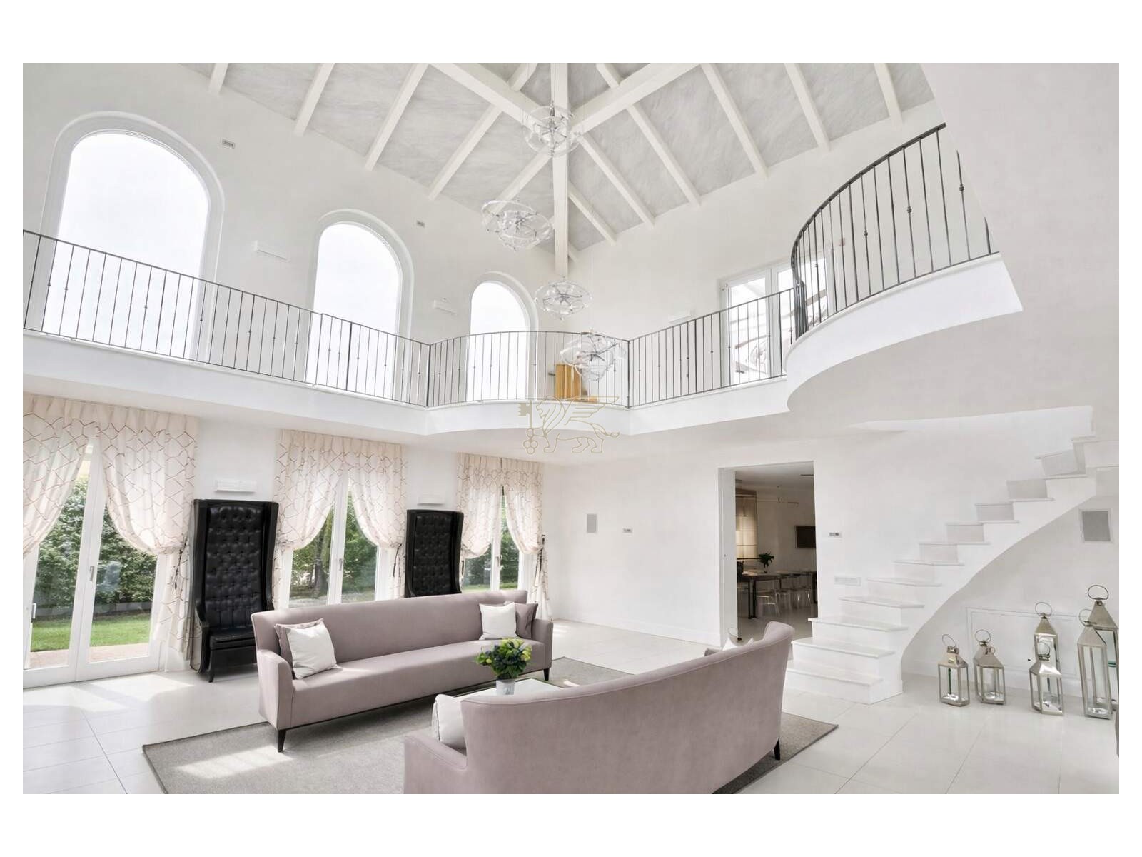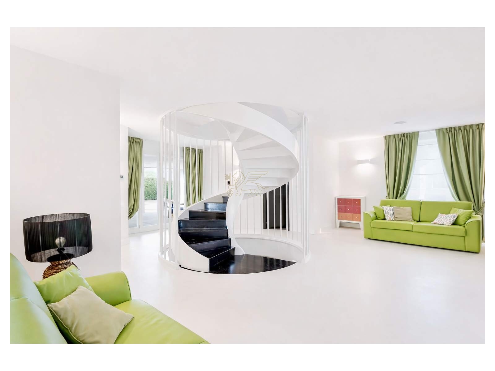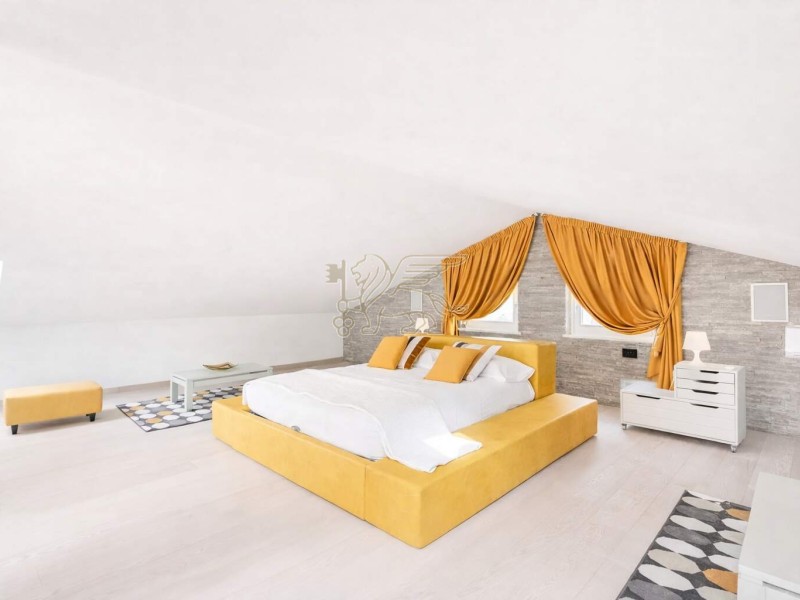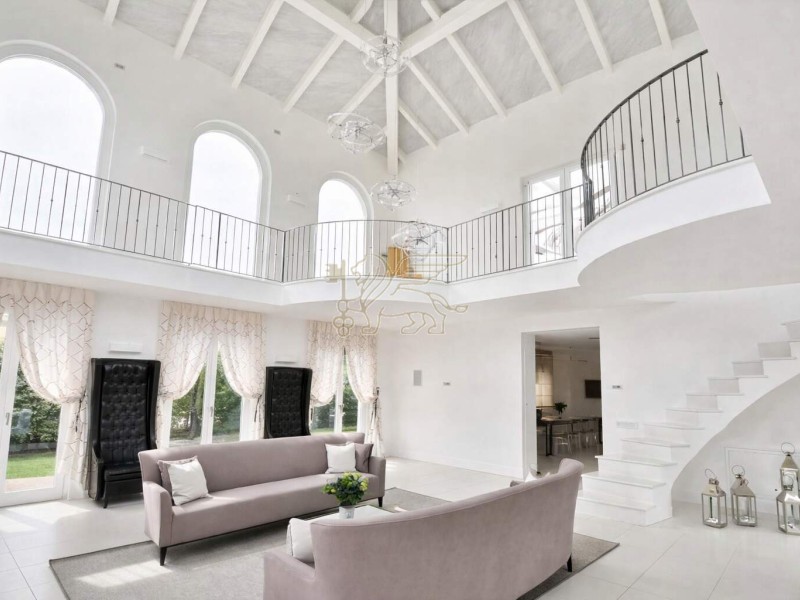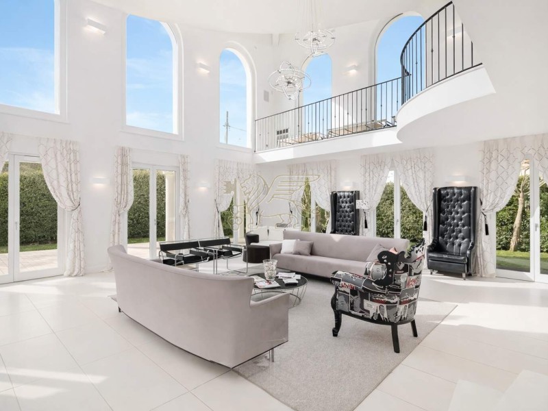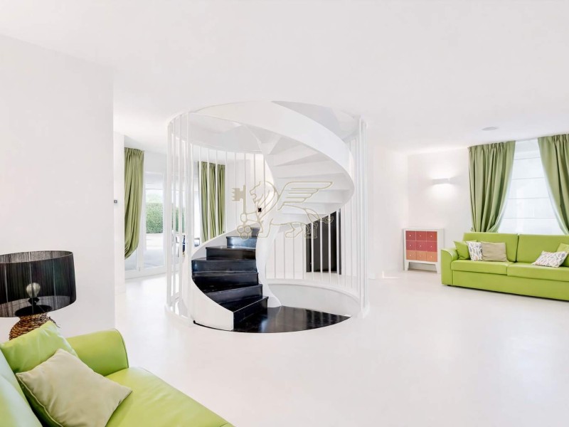 Il cuore della villa è il soggiorno a doppia altezza, molto luminoso, impreziosito da grandi vetrate ad arco e da un volume aperto fino alla copertura. Una scala elicoidale su misura, realizzata da artigiani toscani, collega i piani diventando un vero elemento iconico di design. Dal ballatoio sospeso si accede a una terrazza esterna di circa 60 mq, perfetta per momenti di relax in totale privacy. La zona pranzo è accogliente e conviviale, mentre la cucina moderna con isola è completa di elettrodomestici di fascia alta.