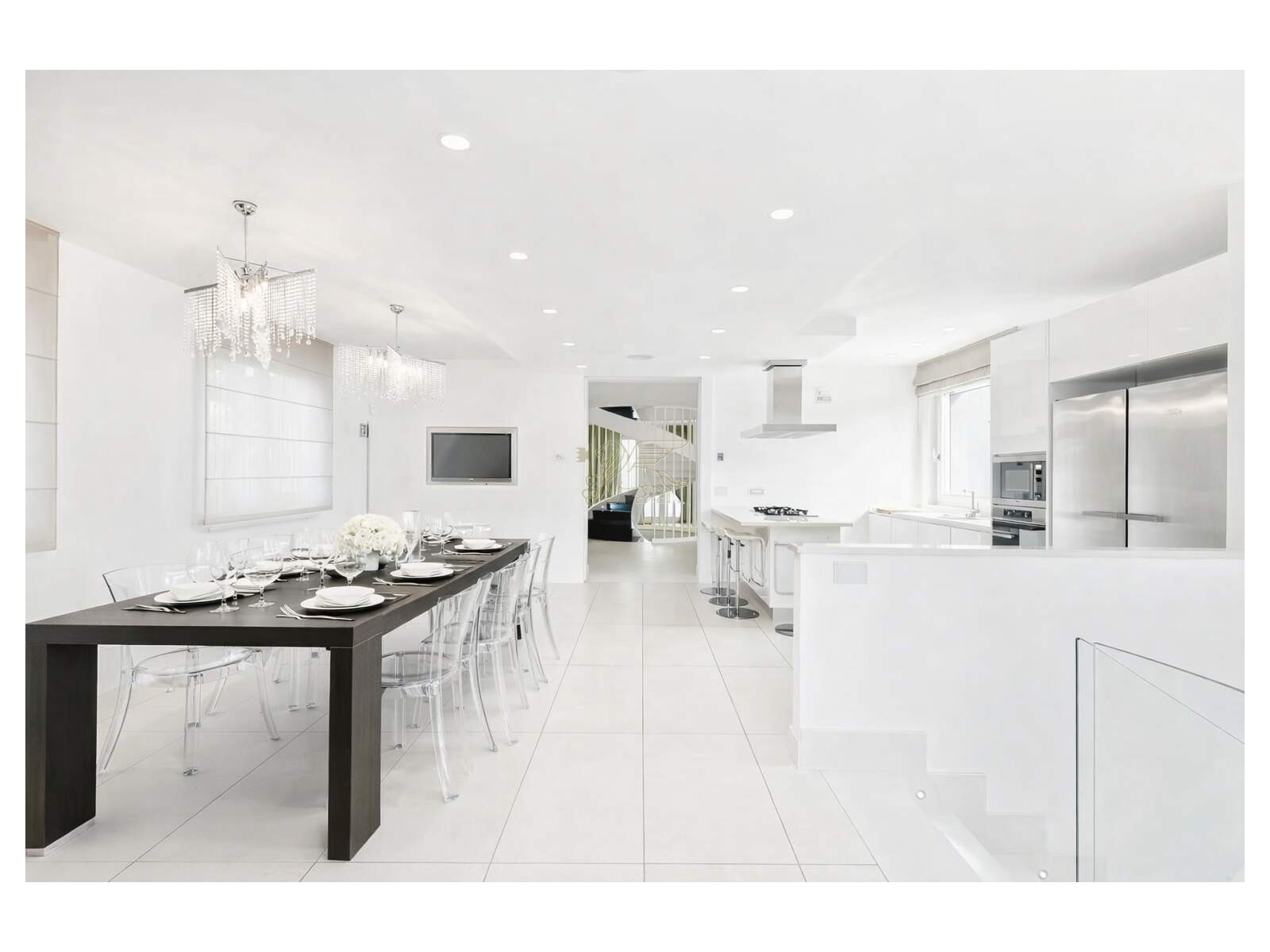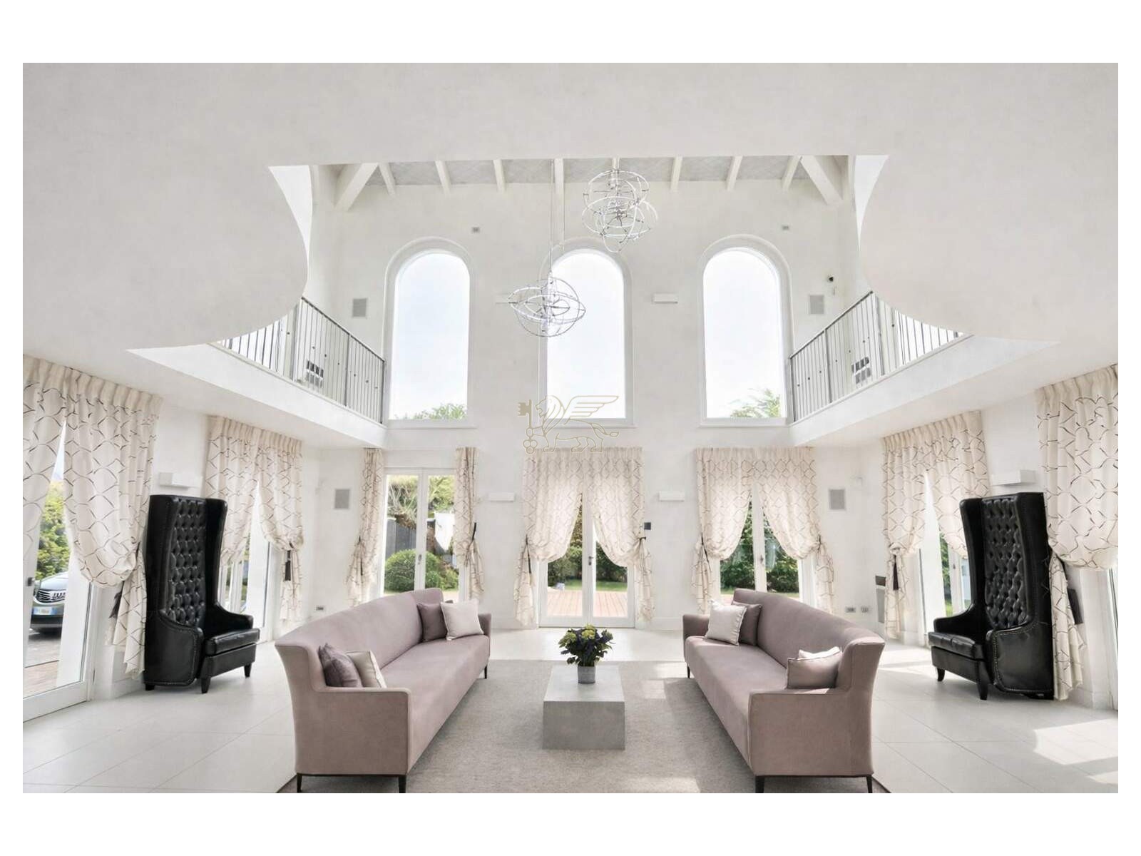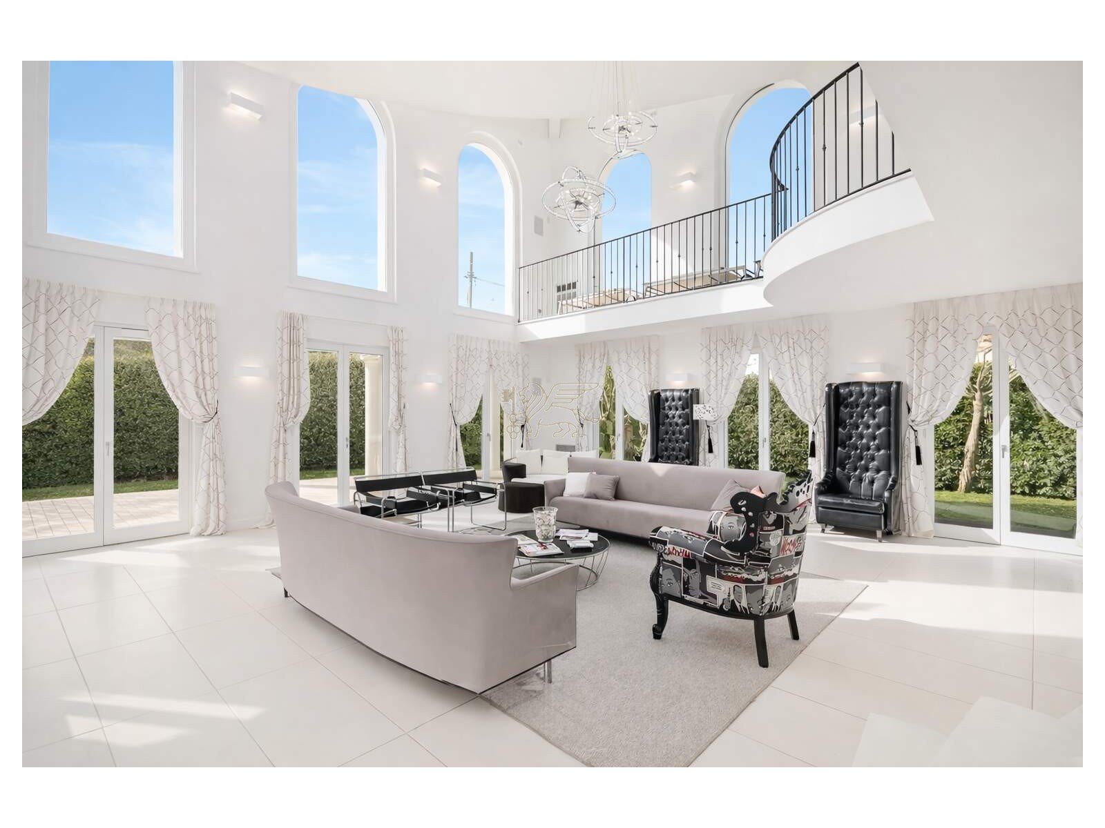 Il cuore della villa è il soggiorno a doppia altezza, molto luminoso, impreziosito da grandi vetrate ad arco e da un volume aperto fino alla copertura. Una scala elicoidale su misura, realizzata da artigiani toscani, collega i piani diventando un vero elemento iconico di design. Dal ballatoio sospeso si accede a una terrazza esterna di circa 60 mq, perfetta per momenti di relax in totale privacy. La zona pranzo è accogliente e conviviale, mentre la cucina moderna con isola è completa di elettrodomestici di fascia alta.