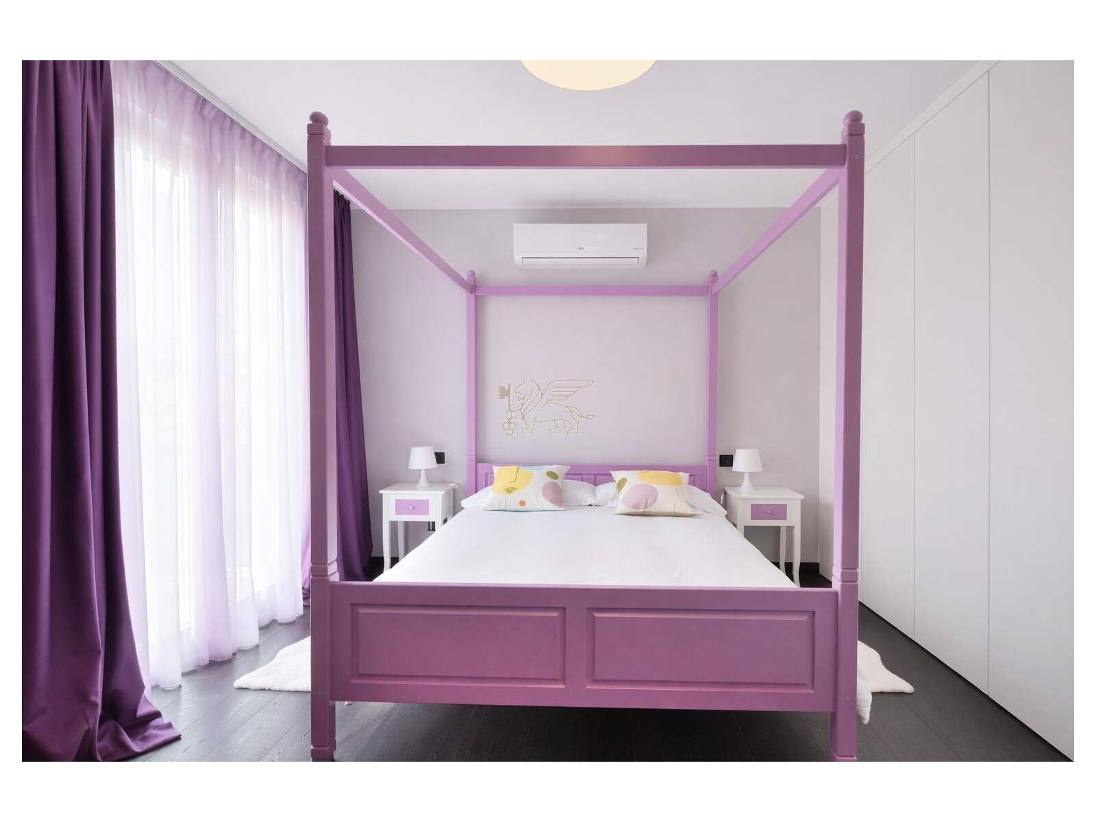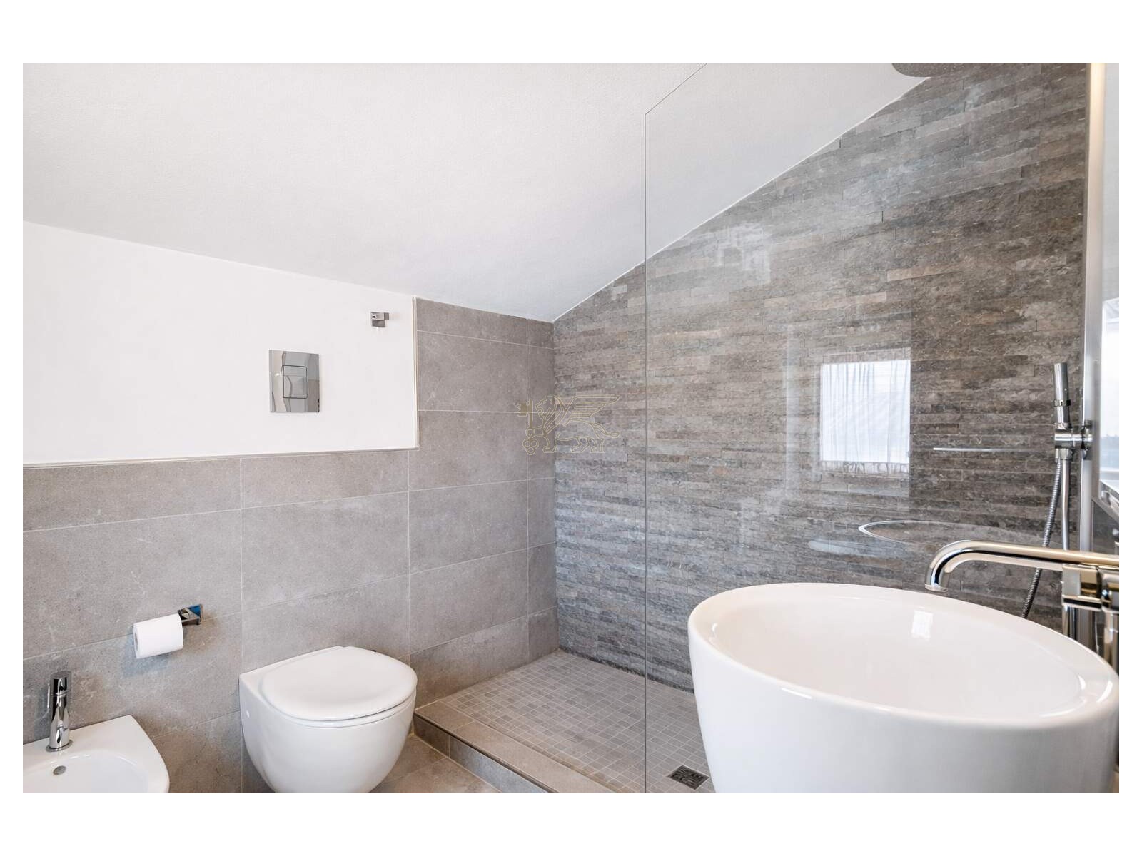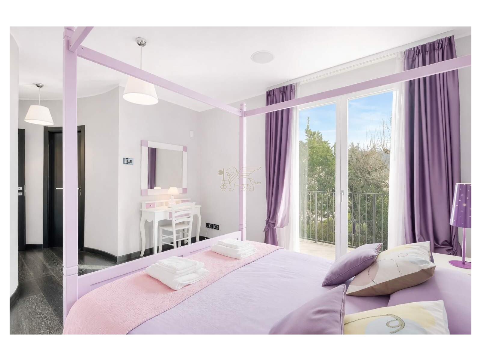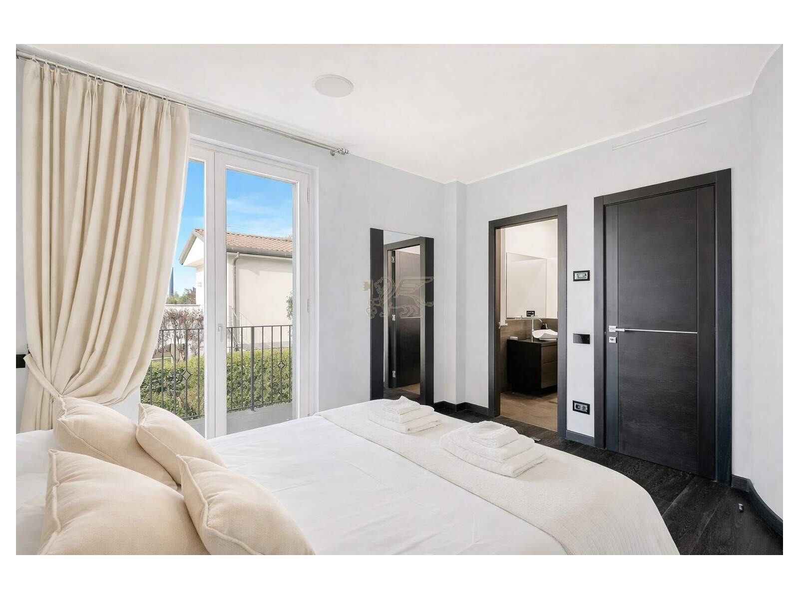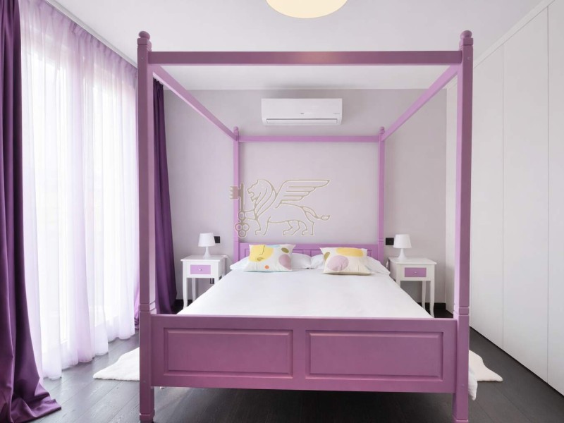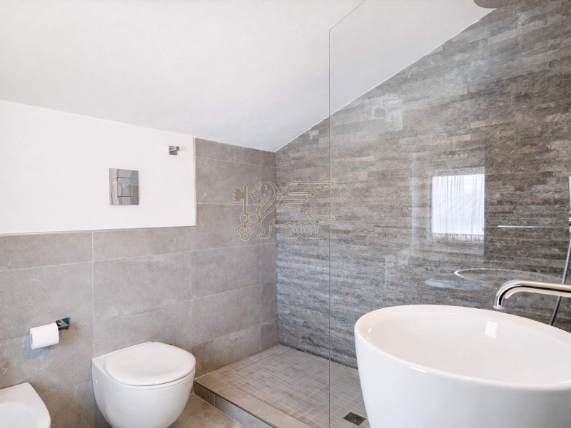 La zona notte è studiata come un’area intima e silenziosa. Suite padronale con terrazza vista Alpi Apuane, cabina armadio e bagno en-suite con ampia walk-in shower; più due matrimoniali con bagno privato e balcone. Quarta camera con bagno en-suite al secondo piano.