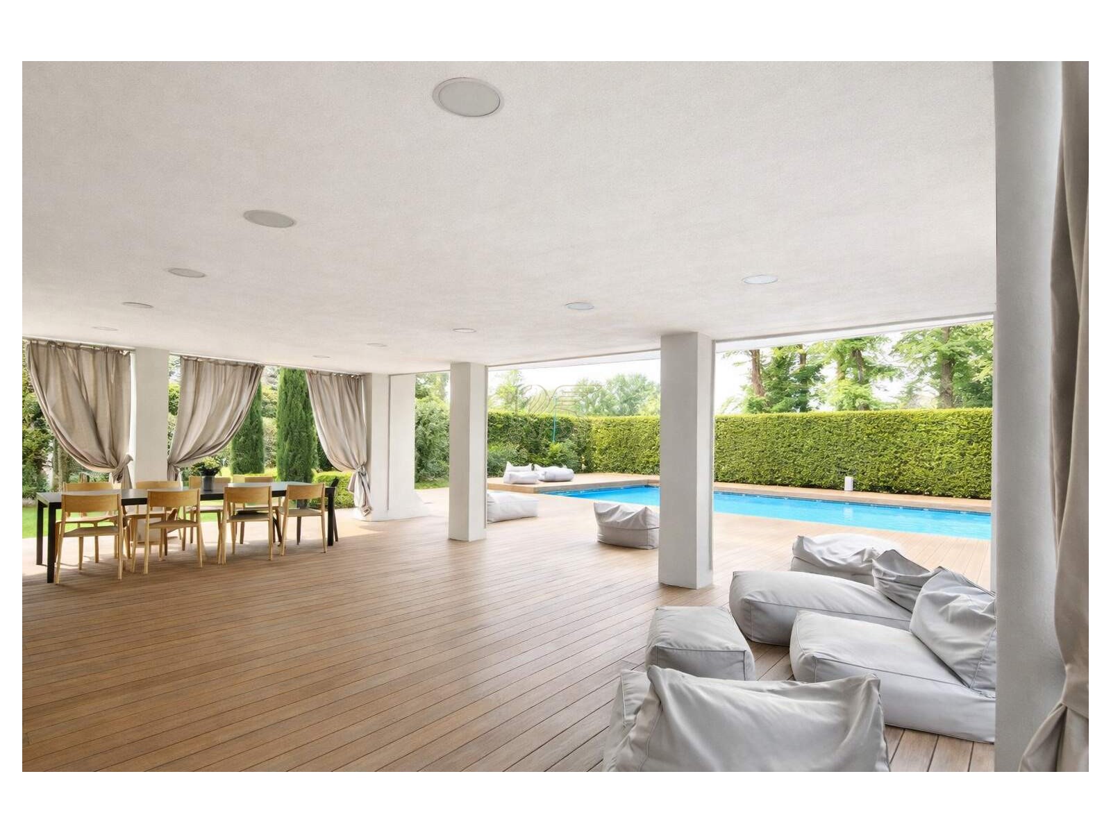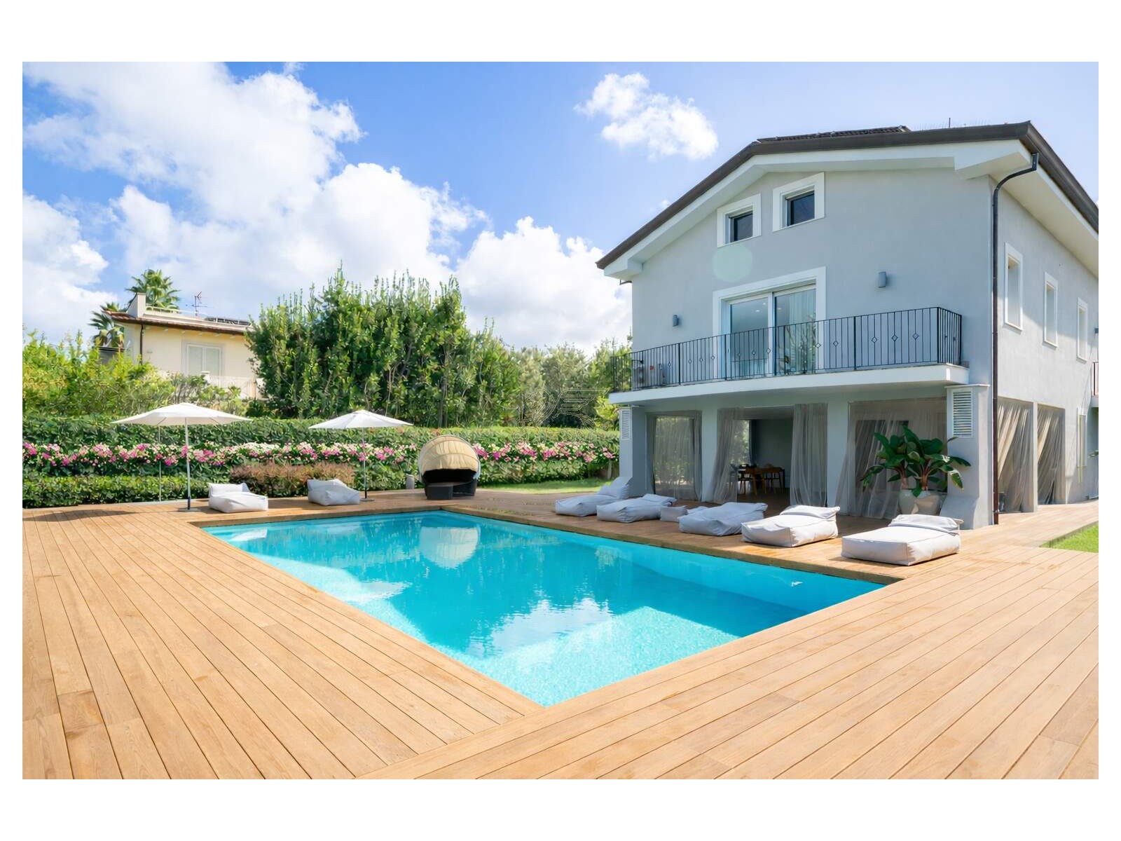Il giardino è curato nei dettagli per garantire privacy e atmosfera. La piscina con copertura elettrica è collocata nella porzione più riservata della proprietà e circondata da pedana in teak con doccia esterna. Il patio coperto, attrezzato per accogliere fino a dieci ospiti, include una cucina outdoor in acciaio inox con grill e lavandino, oltre a filodiffusione audio e Wi-Fi; il tutto protetto da zanzariera perimetrale, per vivere gli esterni con il massimo comfort.