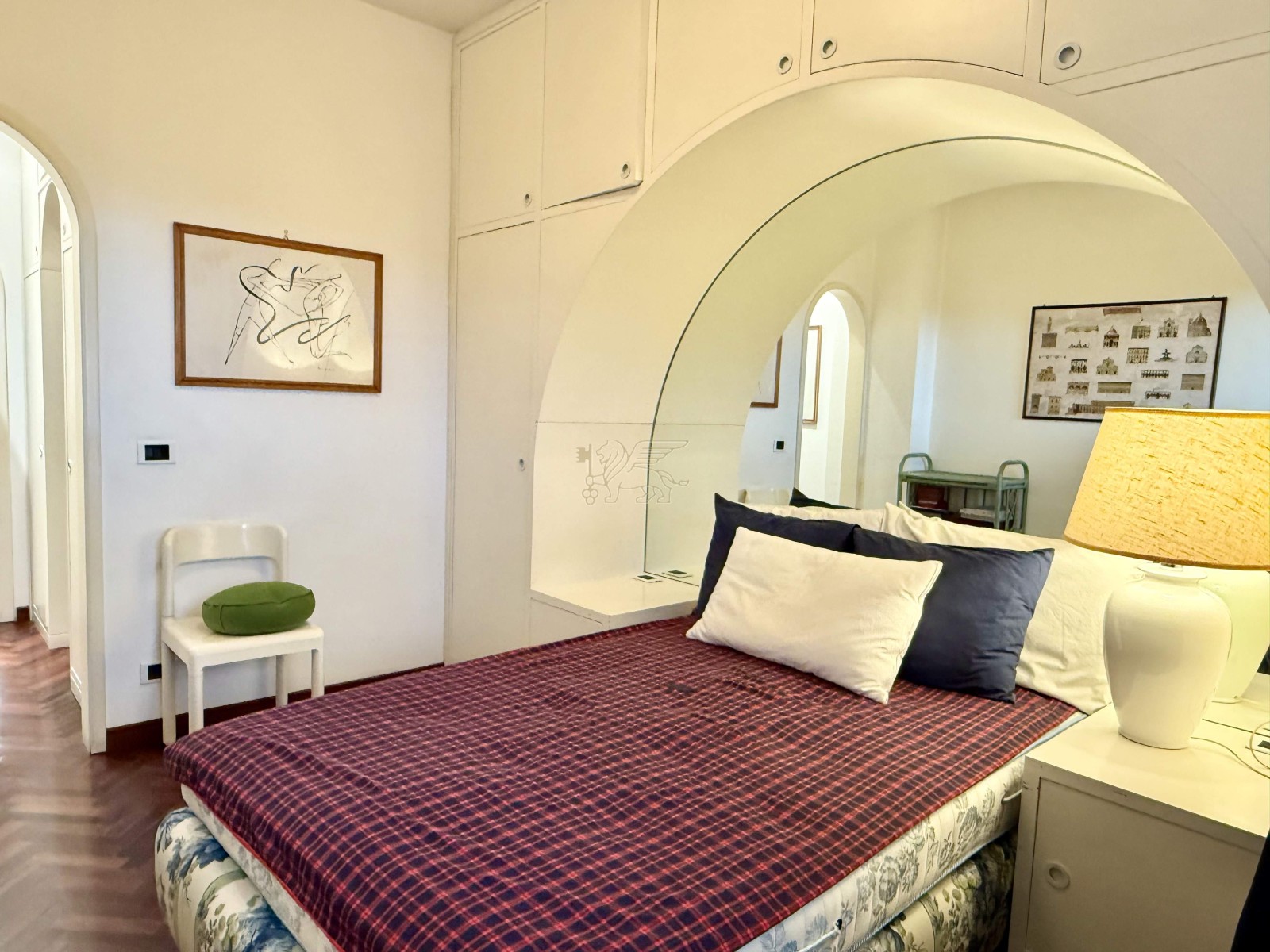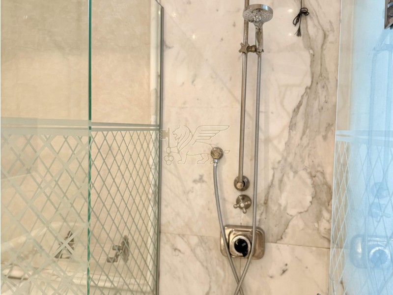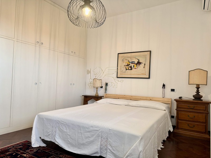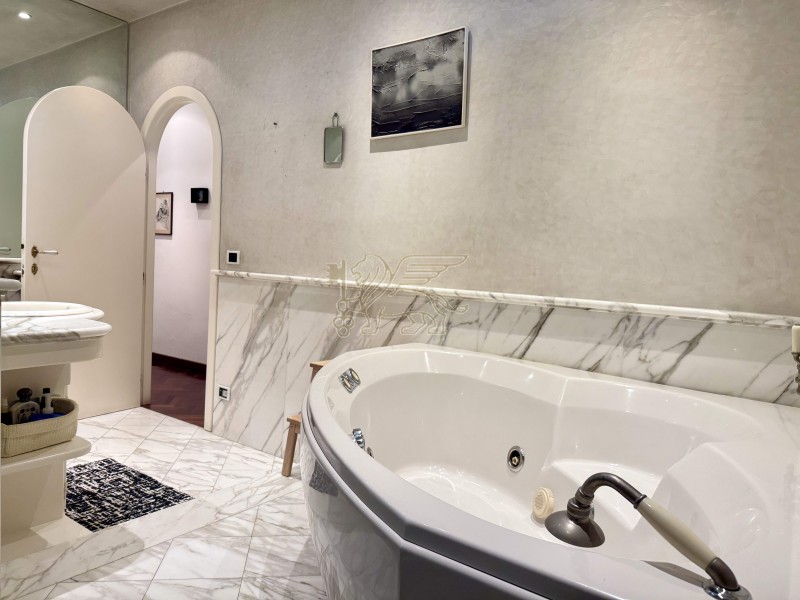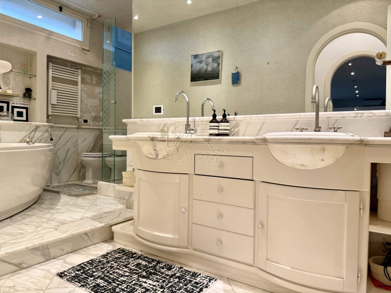 La zona notte si compone di una camera matrimoniale, un bagno con doccia e una suite padronale con stanza armadi dedicata e bagno en-suite finemente rifinito in marmo bianco, dotato di vasca idromassaggio, doccia e doppio lavabo.